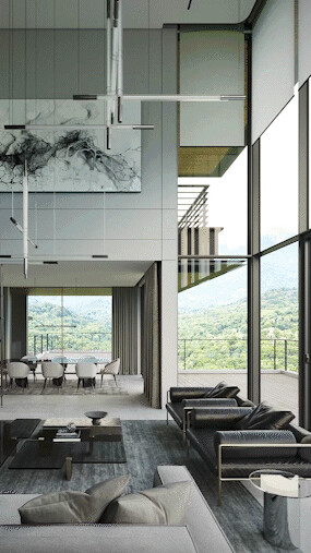 美好生活,是向陽(yáng)而生,向心而居,更是情感的共鳴。設(shè)計(jì)首先要讓人們感受到光。別墅私邸充分利用周邊的自然景觀,通過(guò)大面積的玻璃幕墻窗將山景引入室內(nèi)。這種外墻設(shè)計(jì)核心在于縮減門窗框架的視覺(jué)占比,以減輕建筑的沉重感。讓更多的自然光線與戶外景致涌入室內(nèi),體現(xiàn)人與自然和諧共生的設(shè)計(jì)理念。
